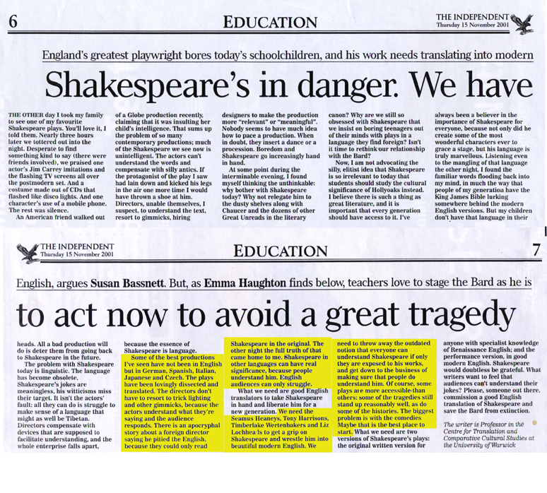 Daß Susan Bassnett in ihrem Amt unzutreffend beschrieben wird, ist kaum verzeihlich. Der Independent gibt ihren Status an als Professor in the Centre for Translation and Comparative Cultural Studies at the University of Warwick. Sie ist jedoch nach ihrer Aussage bereits seit Jahren Professor in the Dept. of English and Comparative Literary Studies. Eine kurze Rückfrage beim Sekretariat der Professorin hätte hier Gewißheit verschaffen können. Der Artikel ist immerhin von 2001, sein Erscheinen lag also zum Zeitpunkt seiner Verwendung für das NRW-Abi 11 Jahre zurück. Soviel zur Sorgfalt der Quellen-Recherche beim MSW.