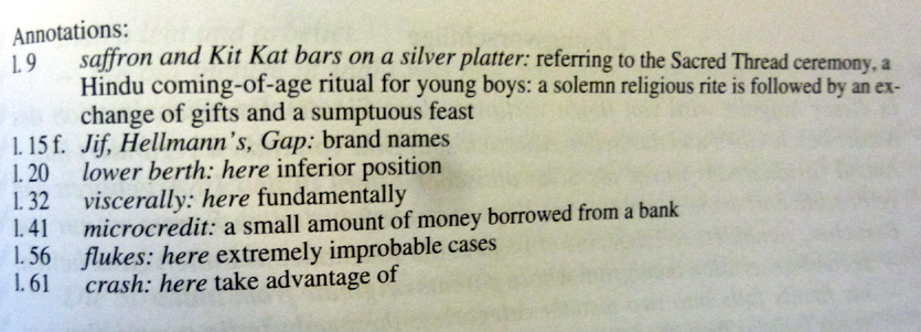 Diese kümmerlichen Annotations sind nutzlos. Schon der erste Eintrag (Zeile 9) muß den Prüfling verwirren: Der Ausdruck selbst wird nicht umschrieben oder erklärt – wie man es erwarten könnte. Statt dessen wird umständlich gemurmelt, worauf er sich bezieht. Das heißt also, die Vokabeln saffron, Kit-Kat bars und silver platter werden nicht erläutert. Das ist so, als würde man bei der DB nach einer Zugverbindung fragen und bekäme eine Erläuterung des Streckenplans.